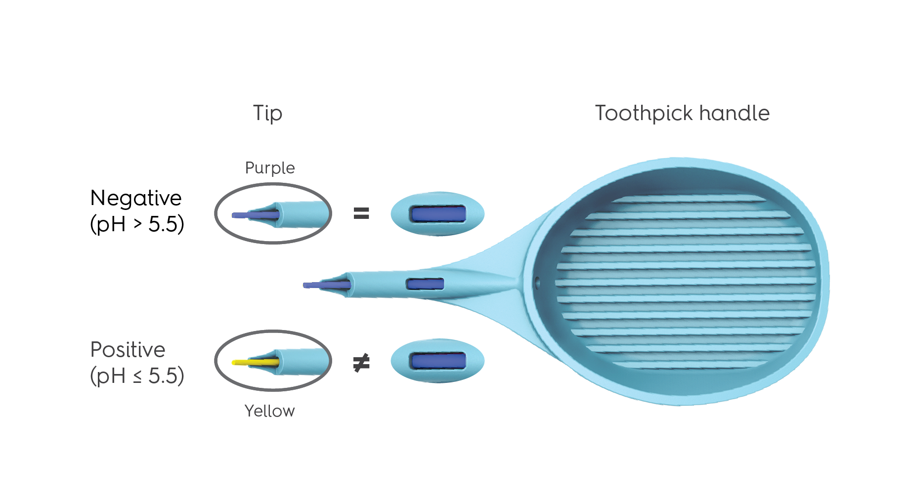 - The pH-sensing tips will change colors in the first 30 seconds after administering the test.